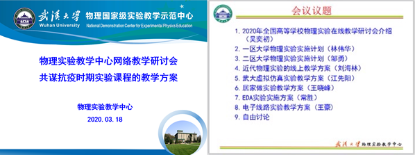 基于各类实验课程面授的学生范围及延迟开学后的教学安排,各位与会成员结合报告内容重点研讨了《大学物理实验》课程的教学方案,就“居家实验及线上虚拟仿真实验”的可行性及实验内容的选取等方面进行了深入详尽的分析与交流,确保开学前学生在家可以完成部分教学内容。